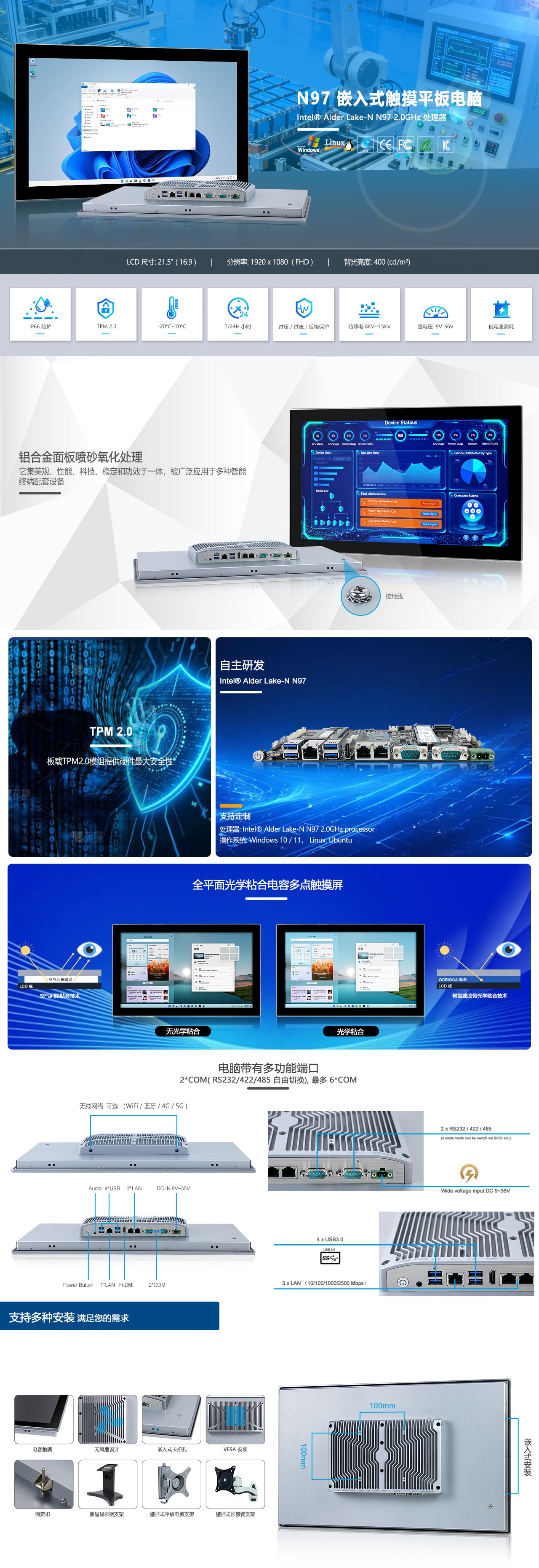 21.5寸液晶屏 / 分辨率 1920 x 1080 (FHD) / Intel Alder Lake-N N97 2.0GHz / 光学粘合电容触摸 / 1 x HDMI / 3 x LAN / 2 x COM(RS232 / 422 / 485)4 x USB3.0 / TPM2.0 / DC 9V~36V 宽压输入,支持过流、过压和反接保护 |
