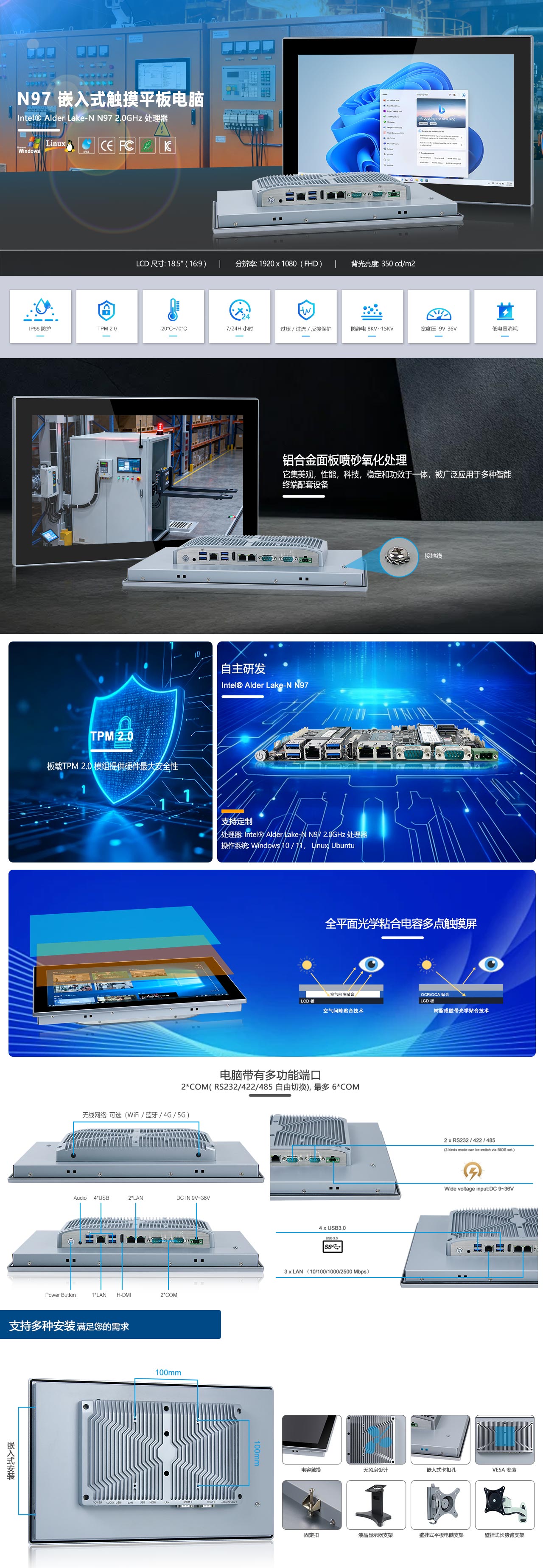 18.5寸液晶屏 / 分辨率 1920 x 1080 (FHD) / Intel Alder Lake-N N97 2.0GHz / 光学粘合电容触摸 / 1 x HDMI / 3 x LAN / 2 x COM(RS232 / 422 / 485)4 x USB3.0 / TPM2.0 / DC 9V~36V 宽压输入,支持过流、过压和反接保护 |