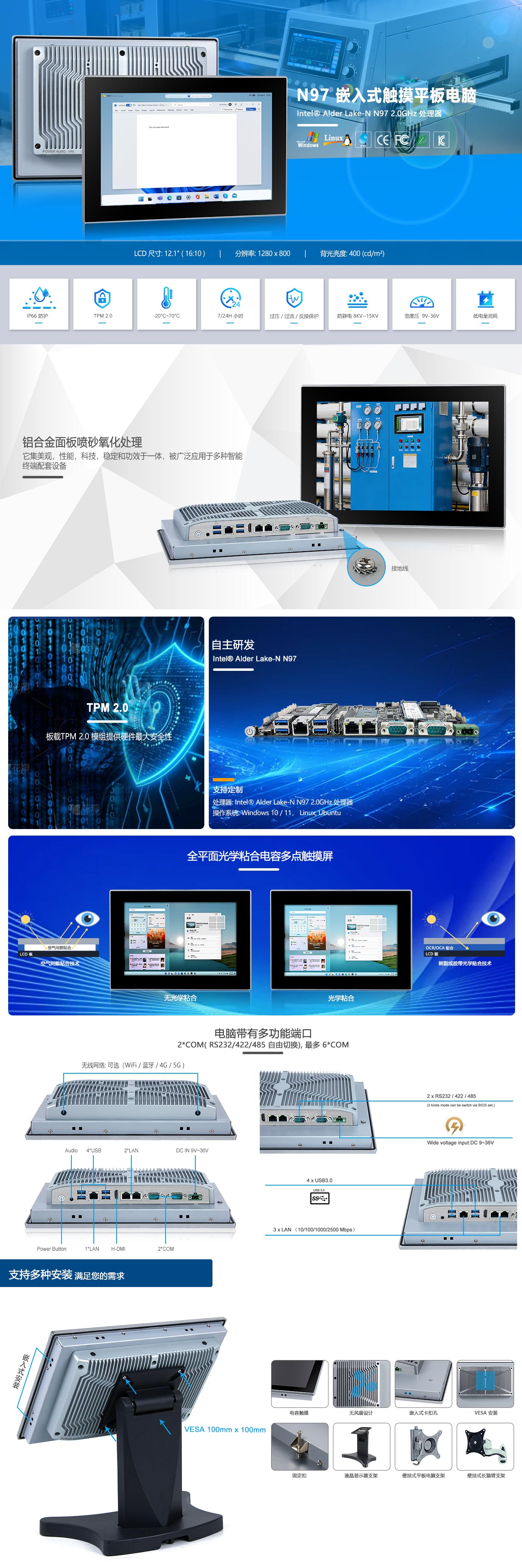 12.1寸液晶屏 / 分辨率 1280 x 800 / Intel Alder Lake-N N97 2.0GHz / 光学粘合电容触摸 / 1 x HDMI / 3 x LAN / 2 x COM(RS232 / 422 / 485)4 x USB3.0 / TPM2.0 / DC 9V~36V 宽压输入,支持过流、过压和反接保护 |