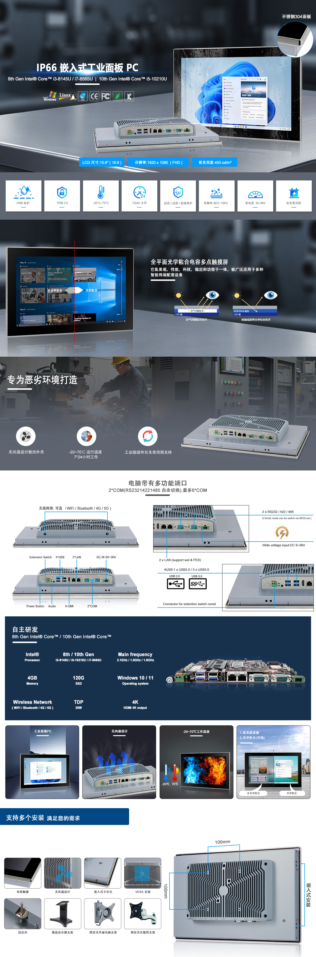 - 工业级15.6" FHD LCD屏,50k背光寿命