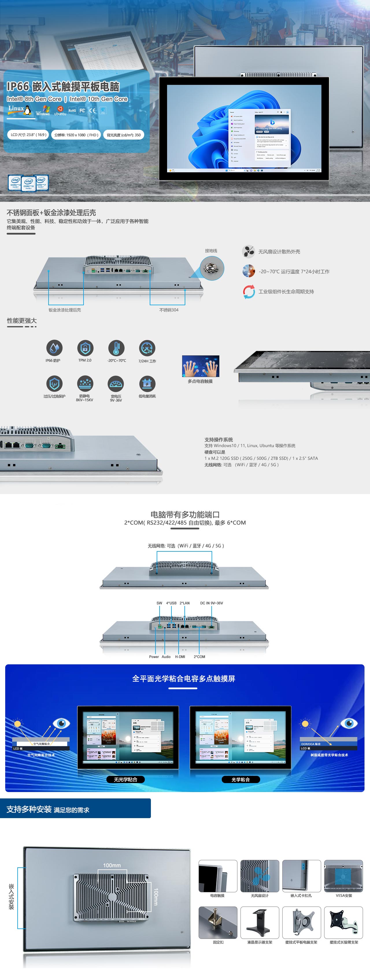 23.8寸液晶屏 / 分辨率 1920 x 1080 (FHD) / 10th Gen Intel® Core™ i5-10210U 1.6GHz / 光学粘合电容触摸 / 1 x H-DMI / 2 x LAN / 2 x COM ( RS232 / 422 /485 ) / 3 x USB3.0 / 1 x USB2.0 / TPM2.0 / DC 9V~36V 宽压输入,支持过流、过压和反接保护 |