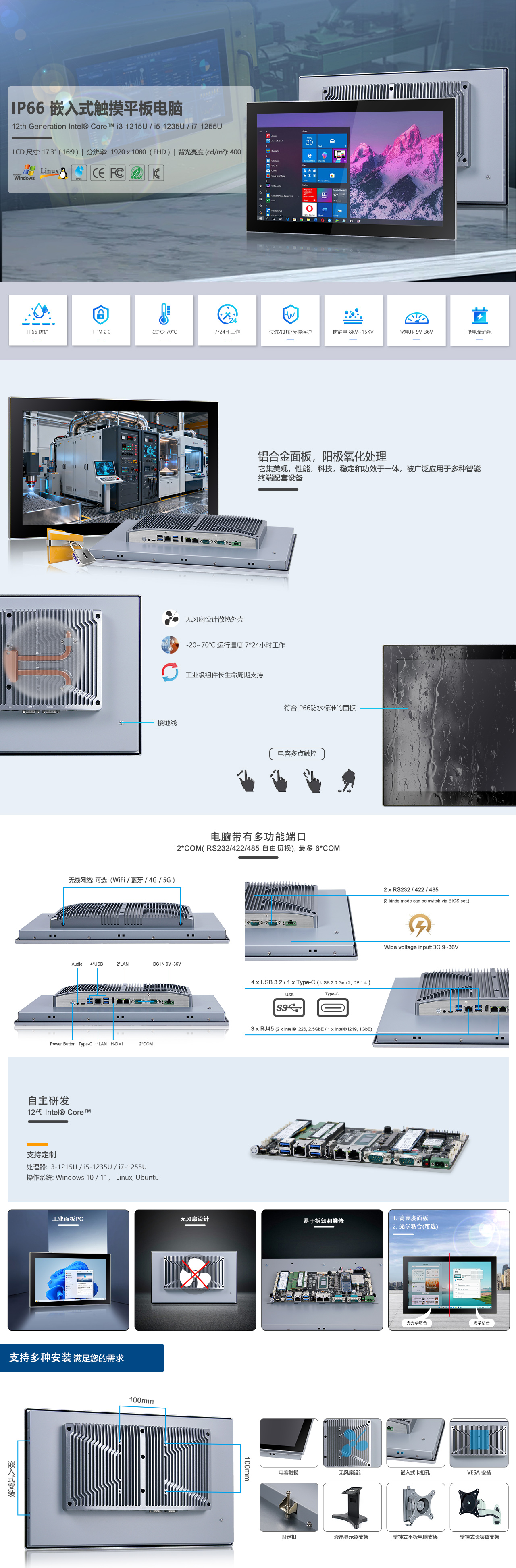 17.3寸液晶屏 / 分辨率 1920 x 1080 / 12th Generation Intel® Core™ i5-1235U 1.3GHz / 电容触摸 / 1 x H-DMI / 3 x LAN / 4 x USB3.2 / 1 x Type-C / 2 x COM / TPM2.0 / DC 9V~36V 宽电压输入,支持过流,过压和反接保护 |