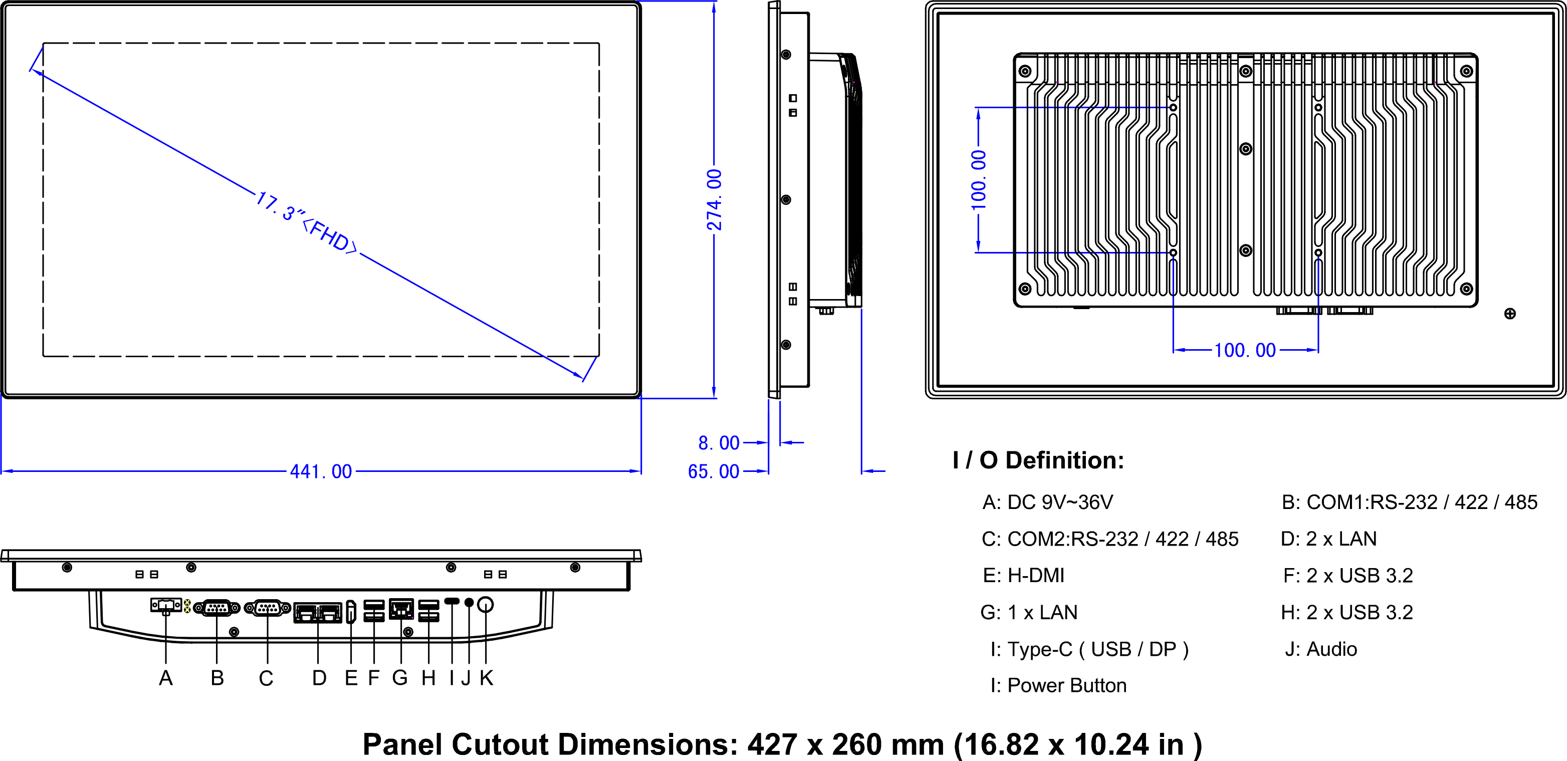17.3寸液晶屏 / 分辨率 1920 x 1080 / 12th Generation Intel® Core™ i3-1215U 1.2GHz / 电容触摸 / 1 x H-DMI / 3 x LAN / 4 x USB3.2 / 1 x Type-C / 2 x COM / TPM2.0 / DC 9V~36V 宽电压输入,支持过流,过压和反接保护 |