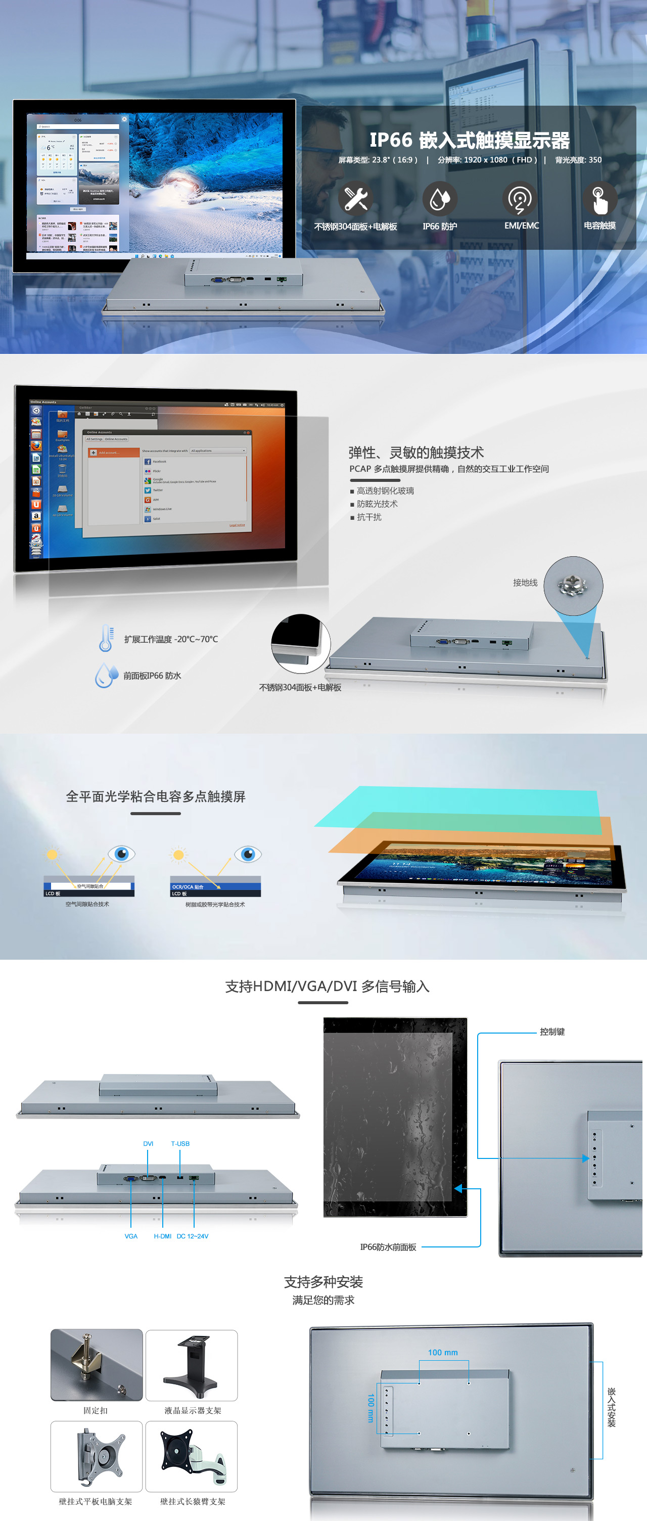 23.8寸液晶屏 / 分辨率 1920 x 1080 / 光学粘合电容触摸 / 1 x VGA / 1 x H-DMI / 1 x DVI / 1 x T-USB / DC 12~24V 宽压输入 |