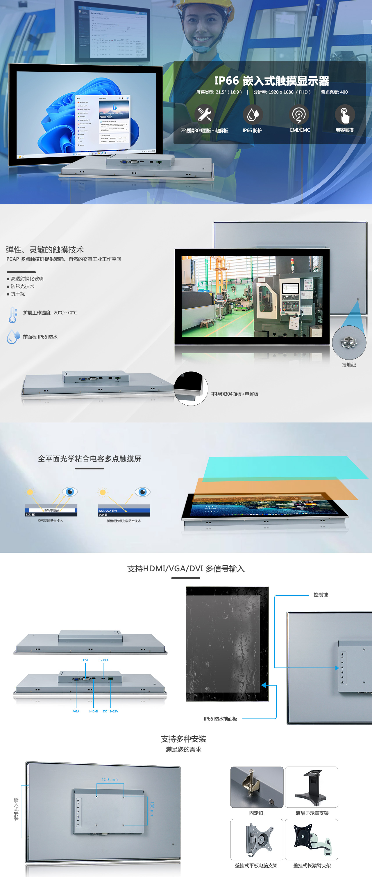 21.5寸液晶屏 / 分辨率 1920 x 1080 / 光学粘合电容触摸 / 1 x VGA / 1 x H-DMI / 1 x DVI / 1 x T-USB / DC 12~24V 宽压输入 |