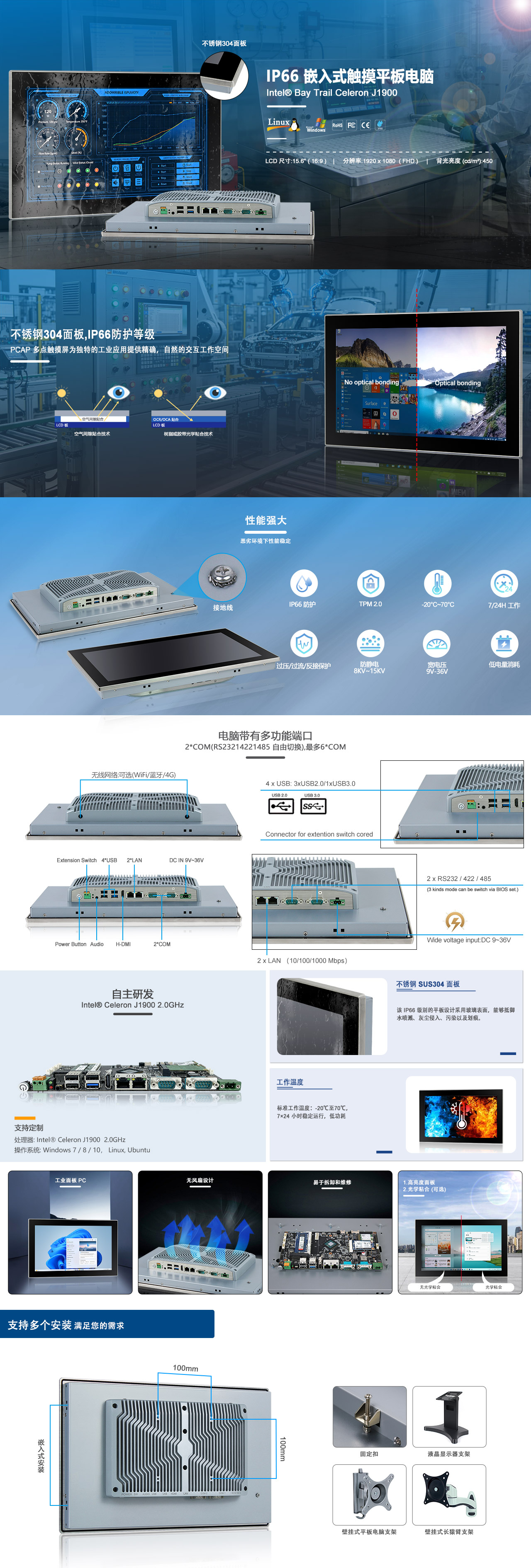 15.6寸液晶屏 / 分辨率 1920 x 1080 (FHD) / Intel Celeron J1900 2.0GHz / 光学粘合电容触摸 / 1 x H-DMI / 2 x LAN / 2 x COM (RS232 / 422 / 485) / 1 x USB3.0 / 3 x USB2.0 / TPM2.0 / DC 9V~36V 宽压输入,支持过流、过压和反接保护 |