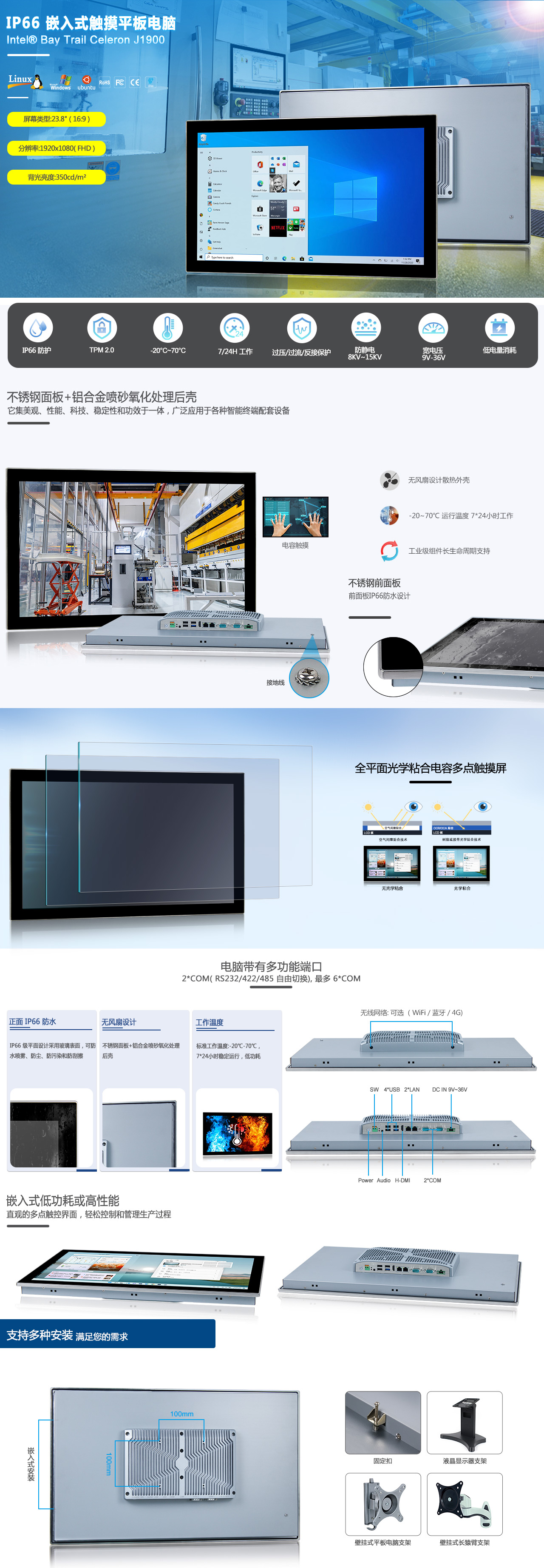 23.8寸液晶屏 / 分辨率 1920 x 1080 (FHD) / Intel Celeron J1900 2.0GHz / 光学粘合电容触摸 / 1 x H-DMI / 2 x LAN / 2 x COM (RS232 / 422 / 485) / 1 x USB3.0 / 3 x USB2.0 / TPM2.0 / DC 9V~36V 宽压输入,支持过流、过压和反接保护 |