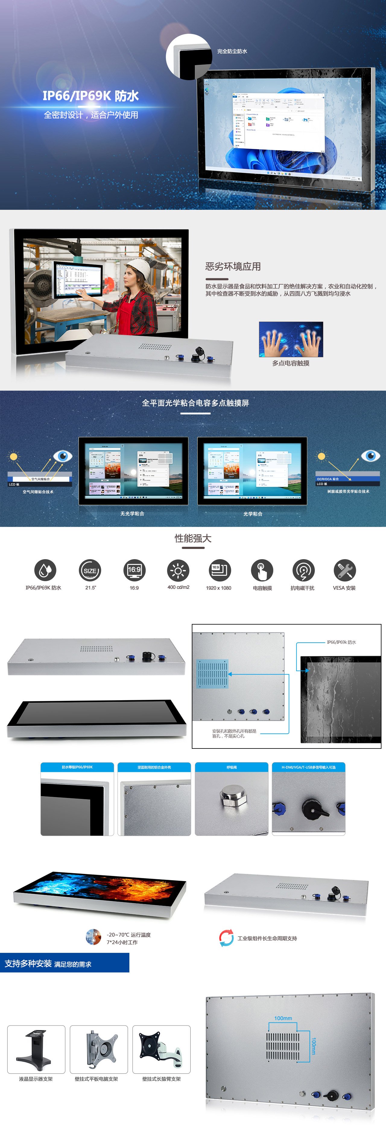 21.5" FHD LED / 分辨率1920x1080 / 光学粘合电容触摸 / 1 x H-DMI / 1 x T-USB / DC 12V~24V 宽压输入 |