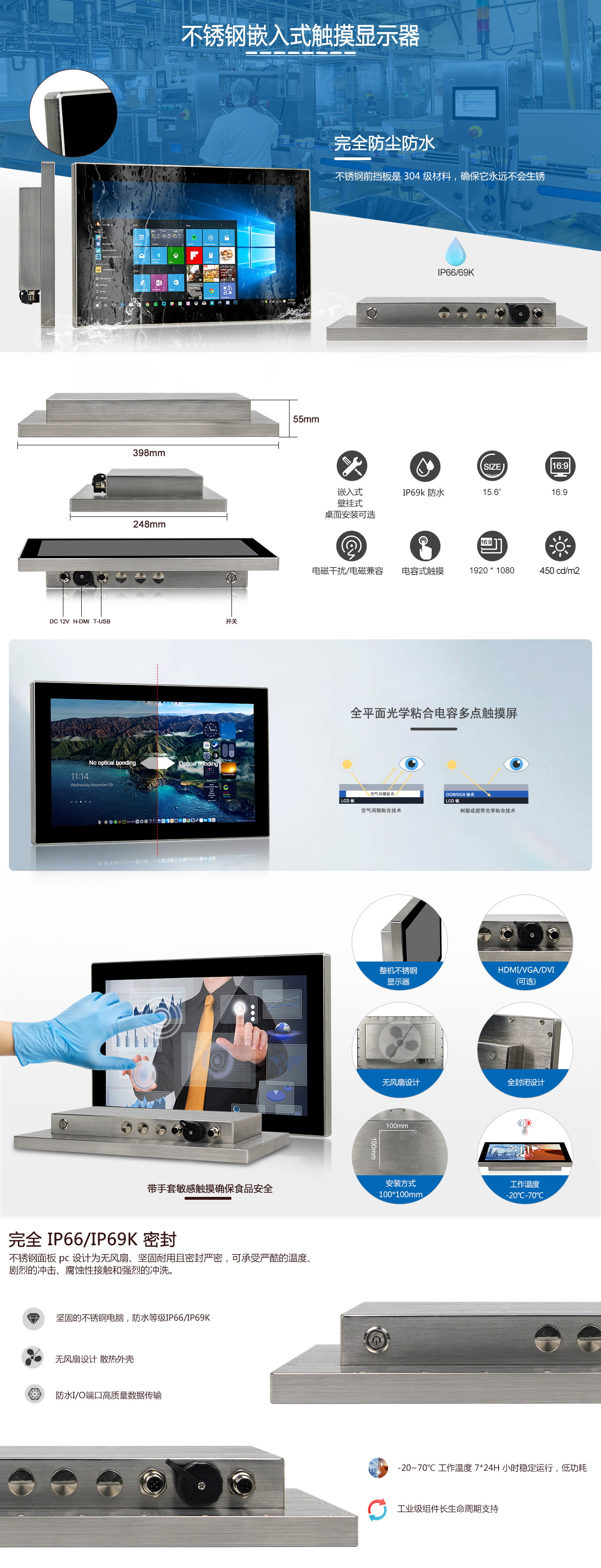 15.6" FHD LED / 分辨率1920x1080 / 光学粘合电容触摸 / 1 x H-DMI / 1 x T-USB / DC 12V~24V 宽压输入 |