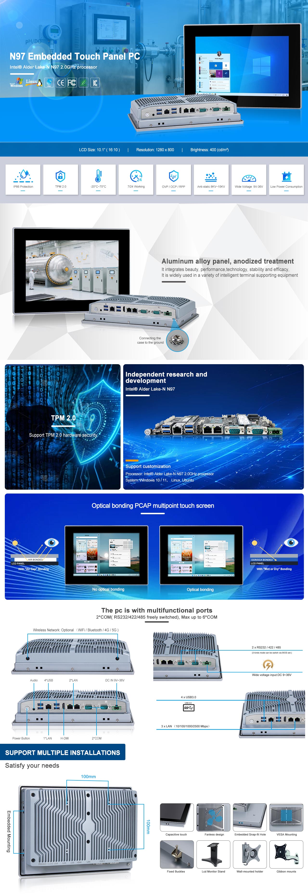 10.1" WXGA LCD / Resolution 1280 x 800 / Intel Alder Lake-N N97 2.0GHz / Optical bonding PCAP Touch / 1 x HDMI / 3 x LAN / 2 x COM (RS232 / 422 / 485) / 4 x USB3.0 / TPM2.0 / DC IN 9V~36V ( OVP / OCP / RPP ) |