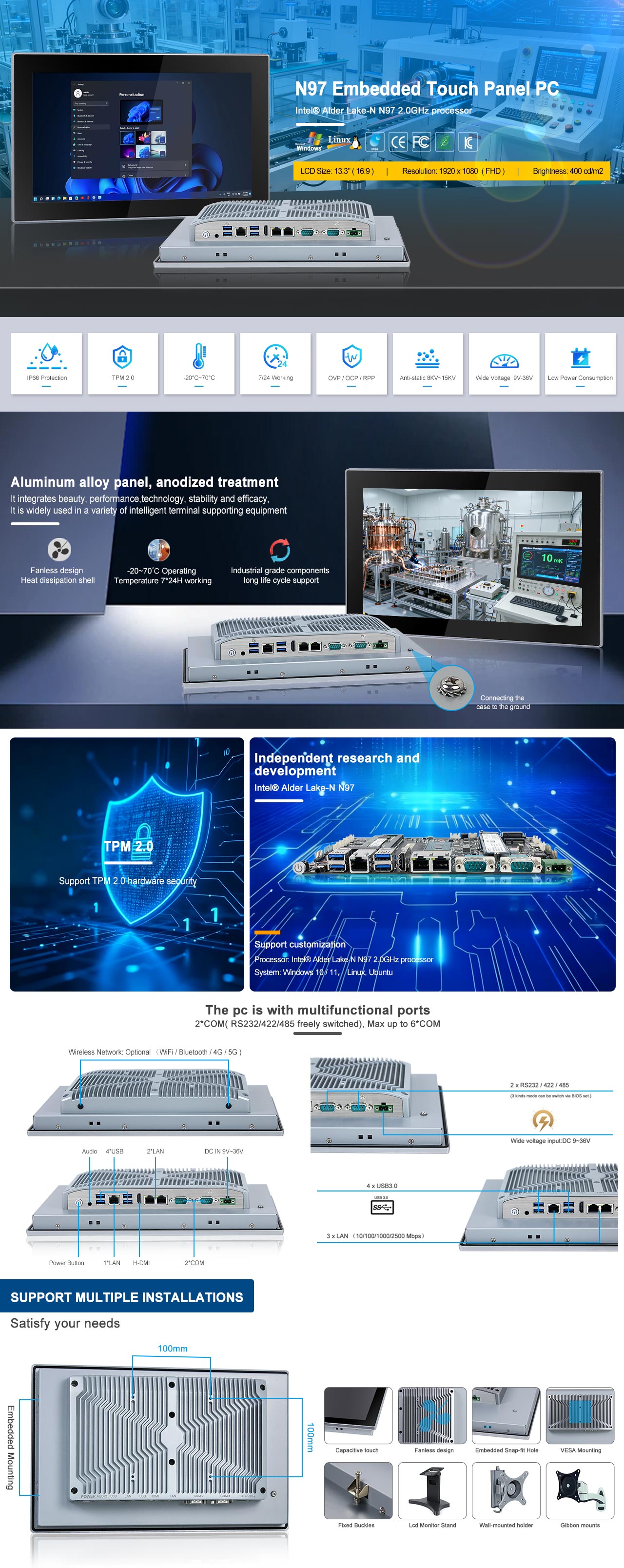 - Industrial-grade 13.3" FHD LCD panel with 50k backlight lifetime