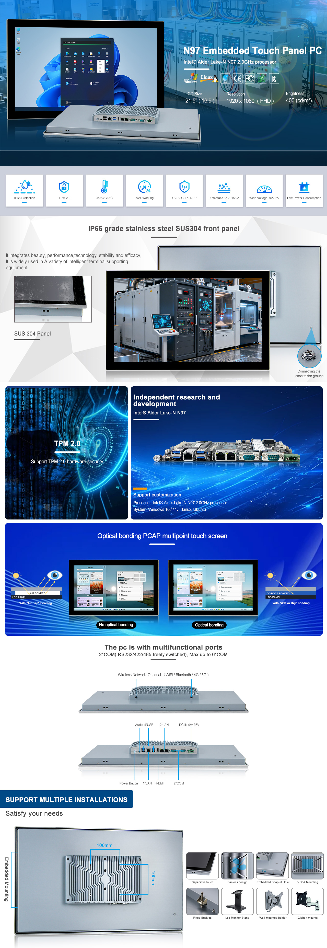 21.5" FHD LCD / Resolution 1920 x 1080 (FHD) / Intel Alder Lake-N N97 2.0GHz / Optical bonding PCAP Touch / 1 x HDMI / 3 x LAN / 2 x COM (RS232 / 422 / 485) / 4 x USB3.0 / TPM2.0 / DC IN 9V~36V ( OVP / OCP / RPP ) |