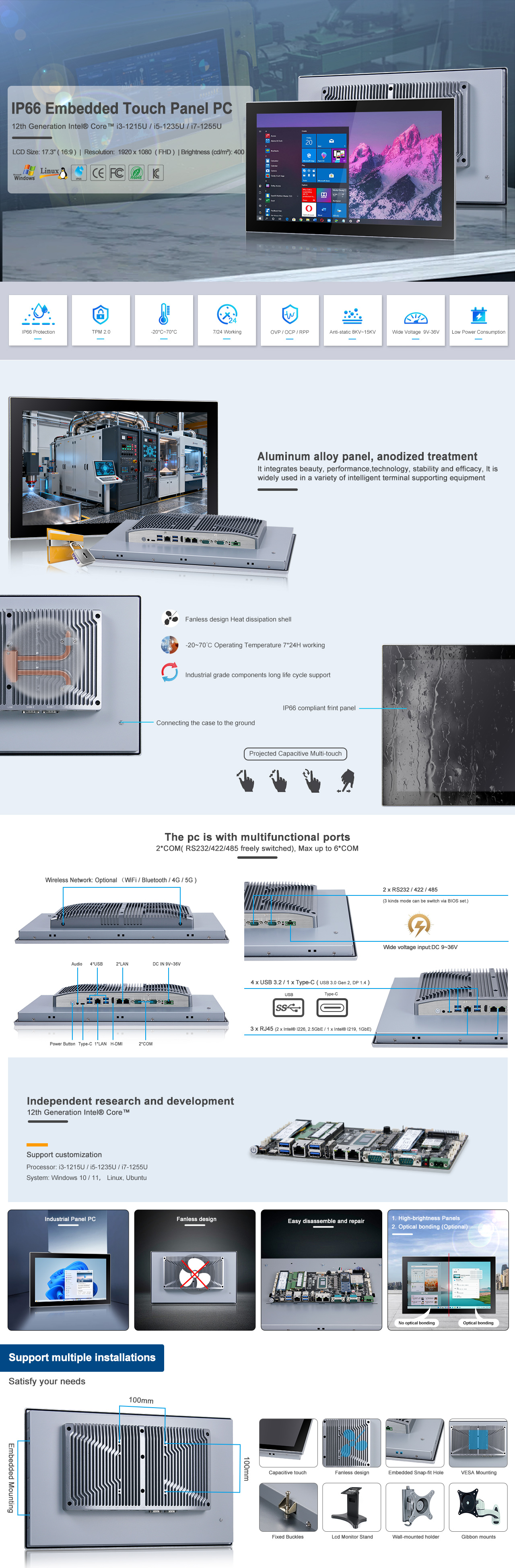 17.3" FHD LCD / Resolution 1920 x 1080 / PCAP Touch / 12th Generation Intel® Core™ i5-1235U 1.3GHz / 1 x H-DMI / 3 x LAN / 4 x USB3.2 / 1 x Type-C / 2 x COM / TPM2.0 / DC IN 9V~36V (OVP / OCP / RPP) |
