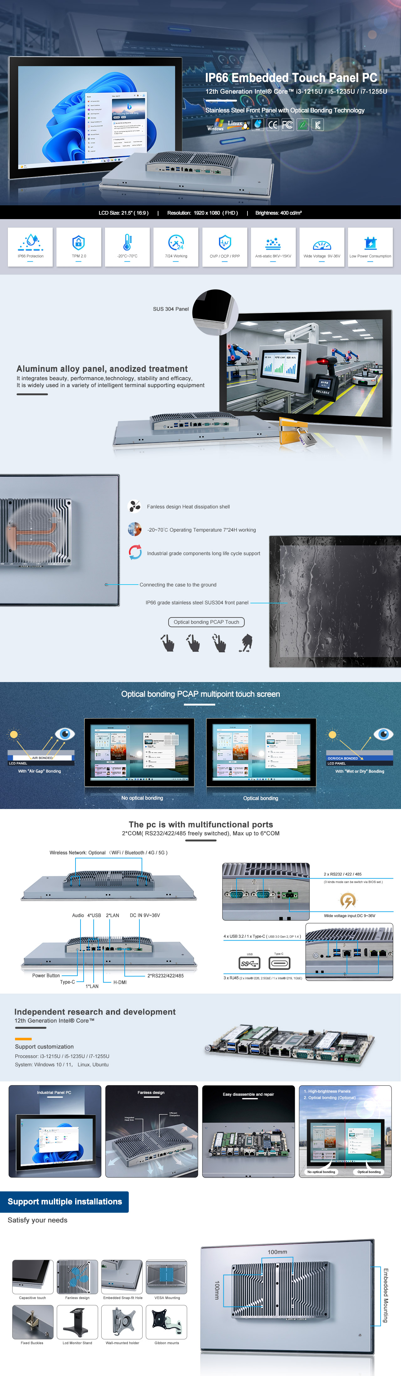 21.5" FHD LCD / Resolution 1920 x 1080 / Optical bonding PCAP Touch / 12th Gen Intel® Core™ i7-1255U 1.7GHz / 1 x H-DMI / 3 x LAN / 4 x USB3.2 / 1 x Type-C / 2 x COM / TPM2.0 / DC IN 9V~36V (OVP / OCP / RPP) |