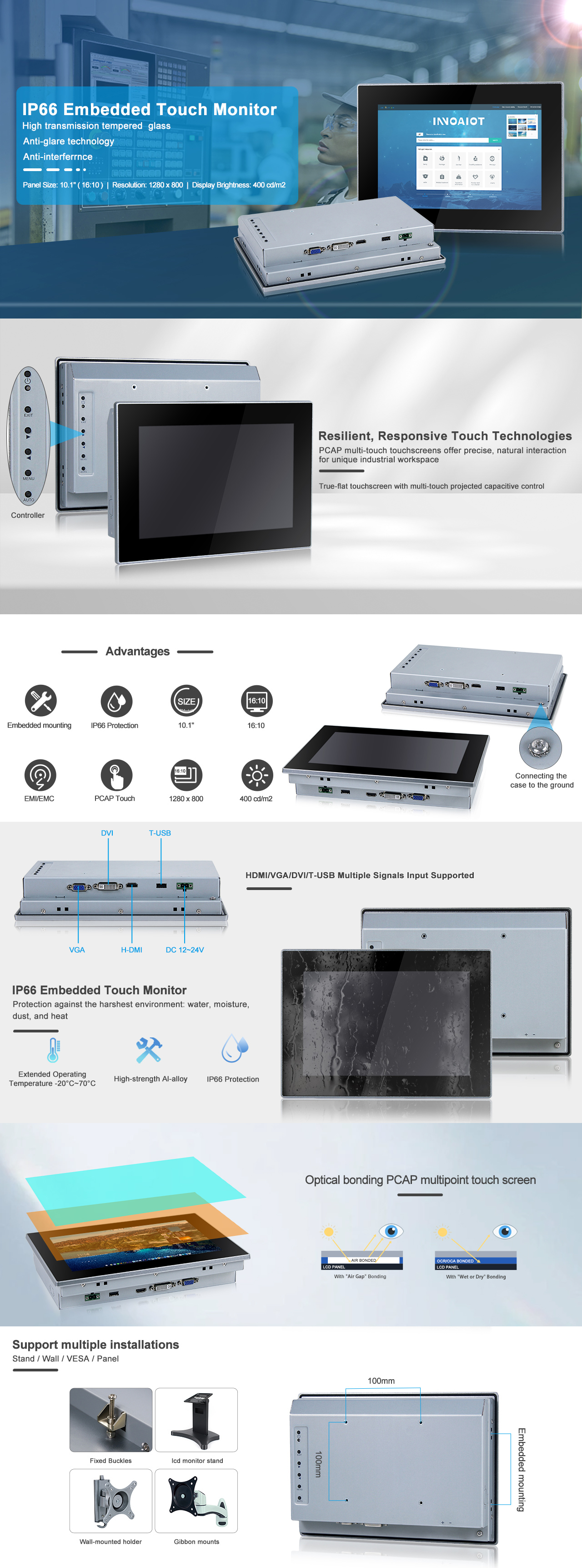 10.1” WXGA LED / Resolution 1280 x 800 / Optical bonding PCAP Touch / 1 x VGA / 1 x H-DMI / 1 x DVI / 1 x T-USB / DC IN 12~24V |