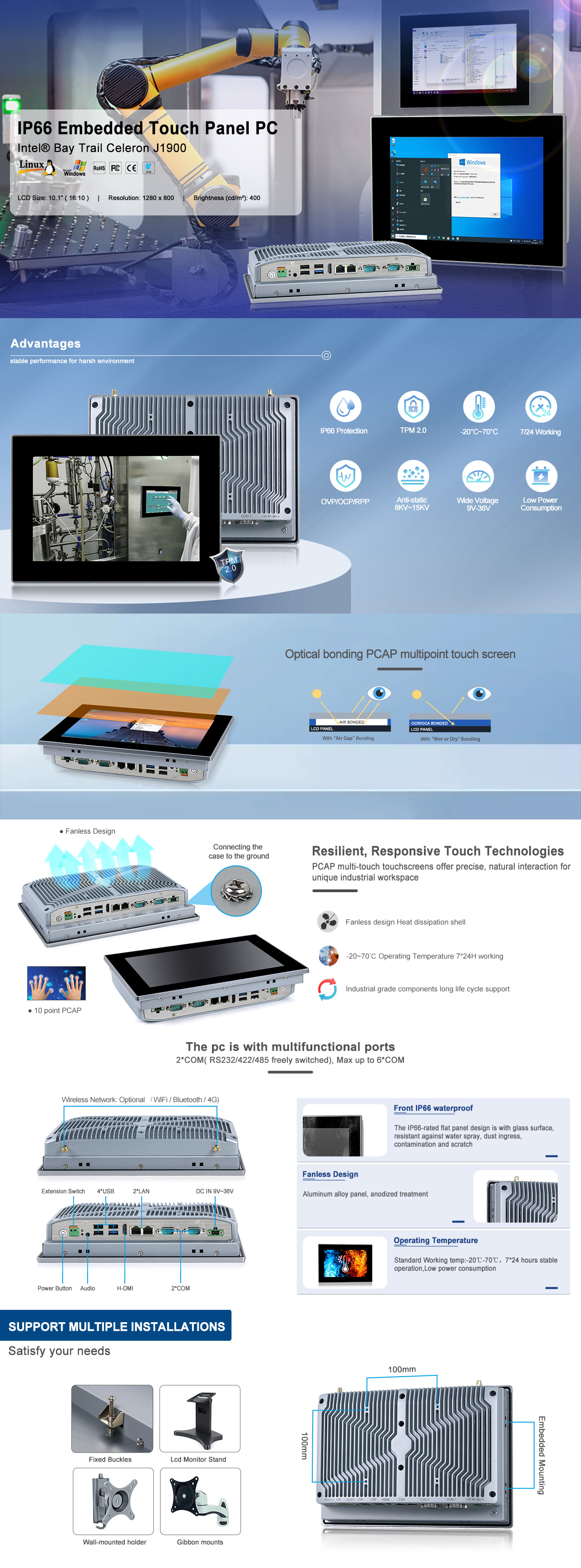 10.1" WXGA LCD / Resolution 1280 x 800 / Intel Celeron J1900 2.0GHz / Optical bonding PCAP Touch / 1 x H-DMI / 2 x LAN / 2 x COM (RS232 / 422 / 485) / 1 x USB3.0 / 3 x USB2.0 / TPM2.0 / DC IN 9V~36V ( OVP / OCP / RPP ) |