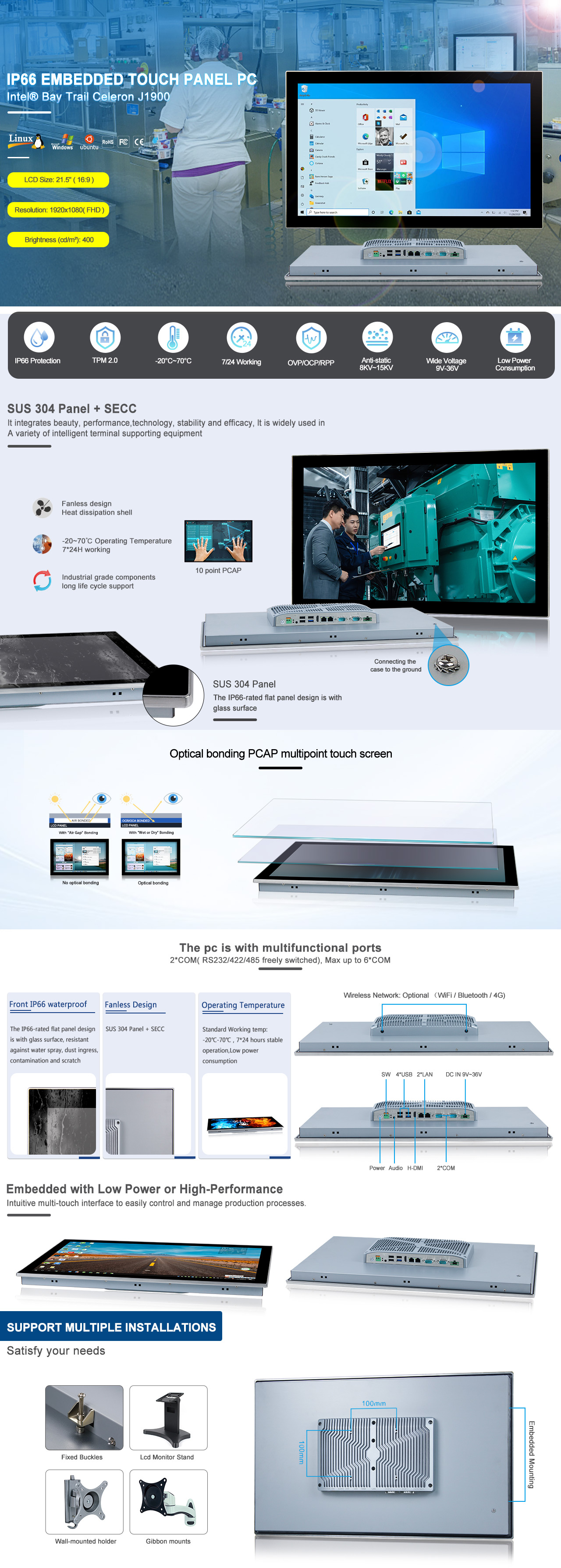 21.5" FHD LCD / Resolution 1920 x 1080 (FHD) / Intel Celeron J1900 2.0GHz / Optical bonding PCAP Touch / 1 x H-DMI / 2 x LAN / 2 x COM (RS232 / 422 / 485) / 1 x USB3.0 / 3 x USB2.0 / TPM2.0 / DC IN 9V~36V ( OVP / OCP / RPP ) |