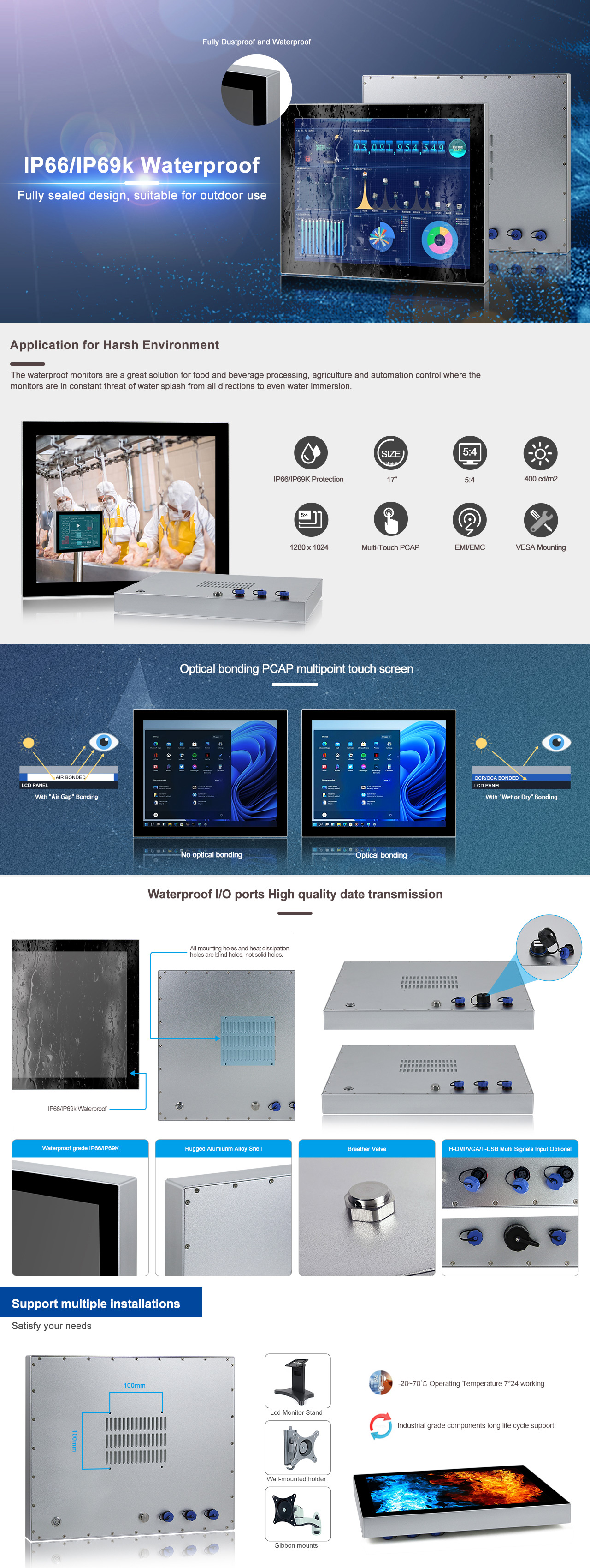 17”SXGA LCD / Resolution 1280x1024 / Optical bonding PCAP Touch / 1 x H-DMI / 1 x T-USB / DC IN 12V~24V |