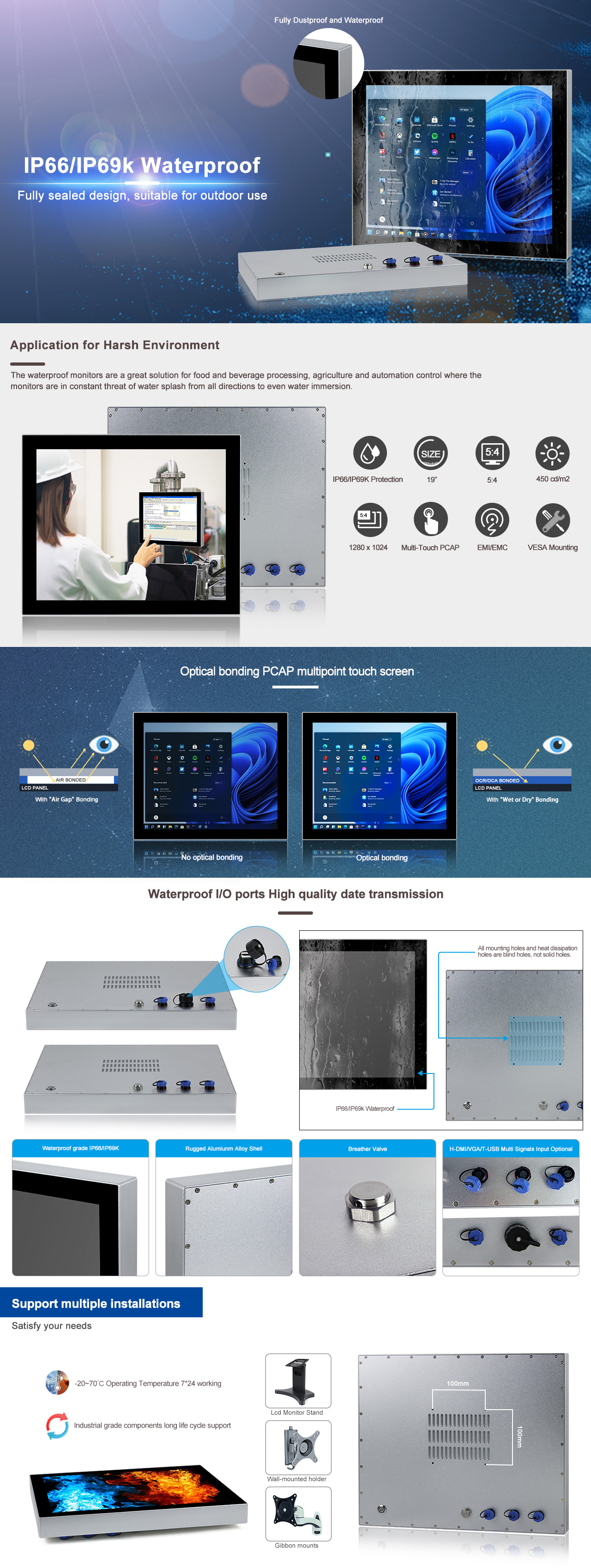 19”SXGA LCD / Resolution 1280x1024 / Optical bonding PCAP Touch / 1 x H-DMI / 1 x T-USB / DC IN 12V~24V |