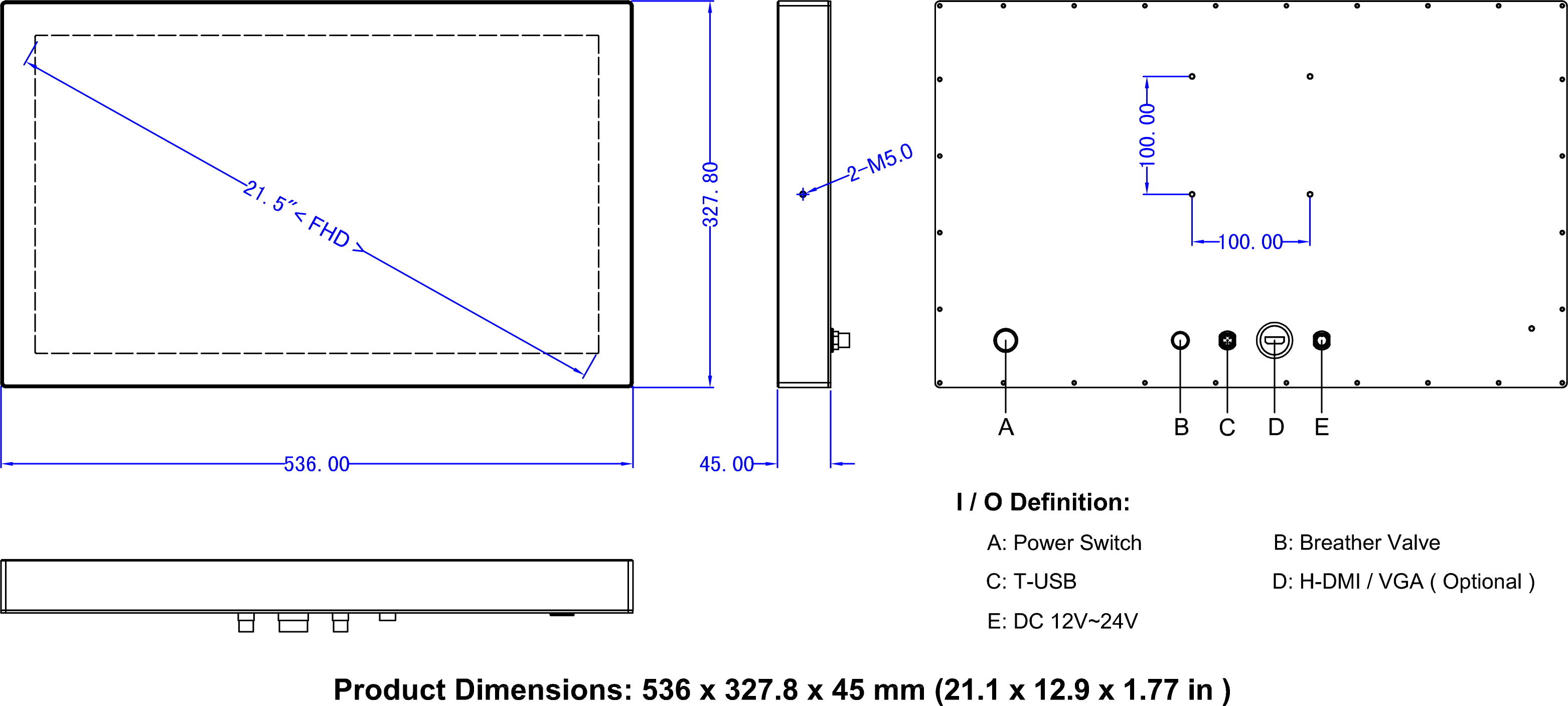 21.5”FHD LCD / Resolution 1920x1080 / Optical bonding PCAP Touch / 1 x H-DMI / 1 x T-USB / DC IN 12V~24V |