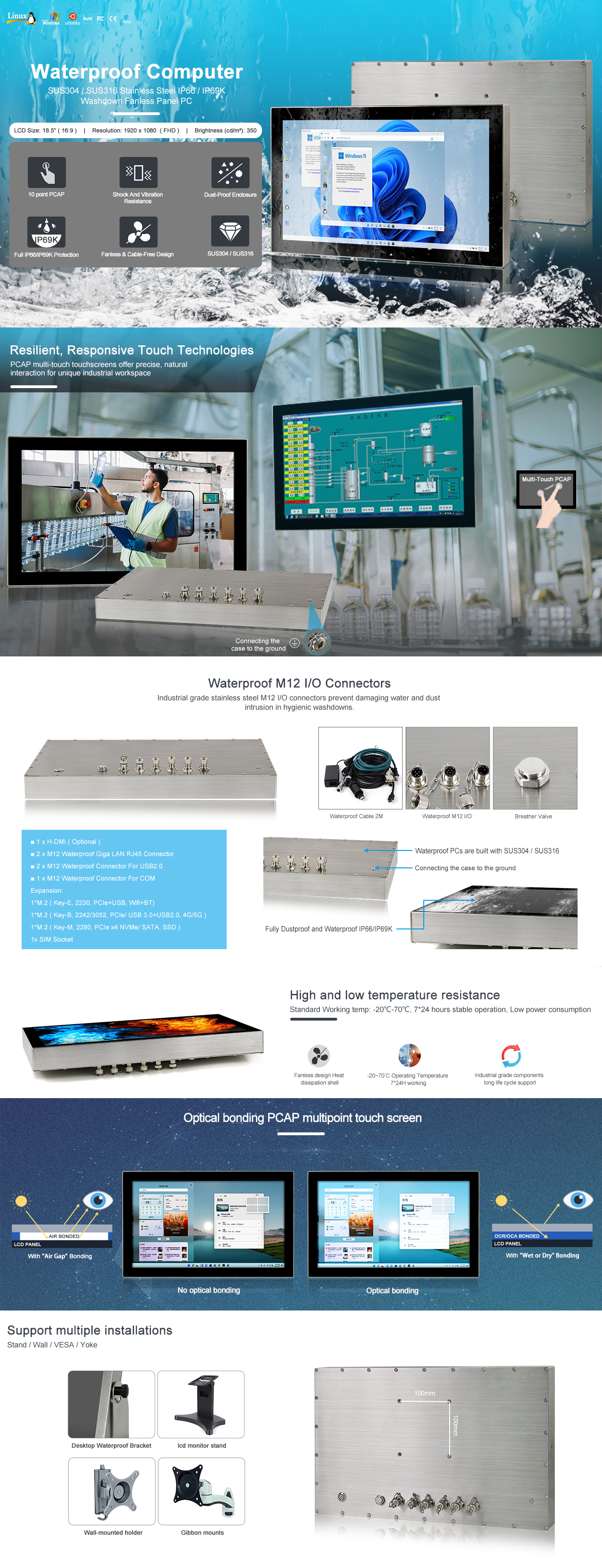 18.5" FHD LCD / Resolution 1920 x 1080 / Intel® Celeron J1900 2.0GHz / Optical bonding PCAP Touch / 2 x LAN / 1 x COM / 2 x USB / DC IN 12V~24V |