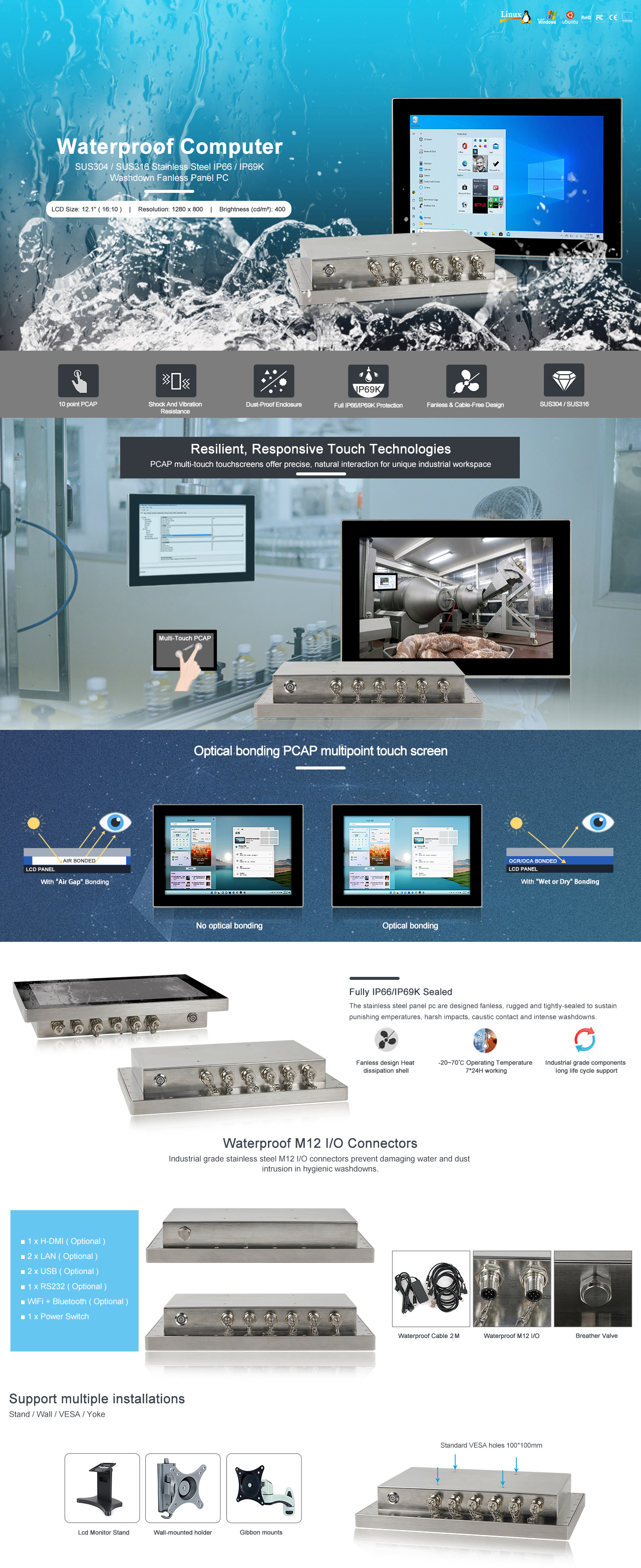 12.1" WXGA LCD / Resolution 1280 x 800 / 6th Gen Intel® Skylake Core i5-6200U 2.3GHz / Optical bonding PCAP Touch / 2 x LAN / 1 x COM / 2 x USB / DC IN 12V~24V |