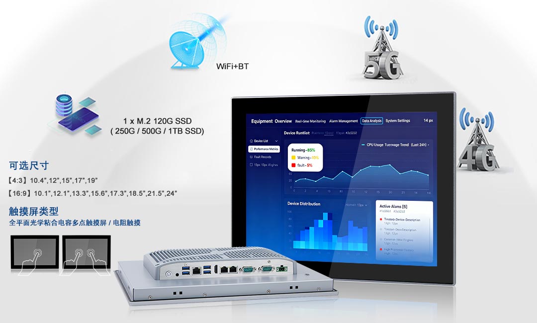 PPC系列支持多种无线通信技术,同时支持4G/5G技术,可确保实时通信和高速数据传输的稳定移动连接、为了系统扩展更加方便,PPC系列配备了一个M.2接口,用于集成4G/5G模块,以及用于Wi-Fi和蓝牙模块M.2插槽。