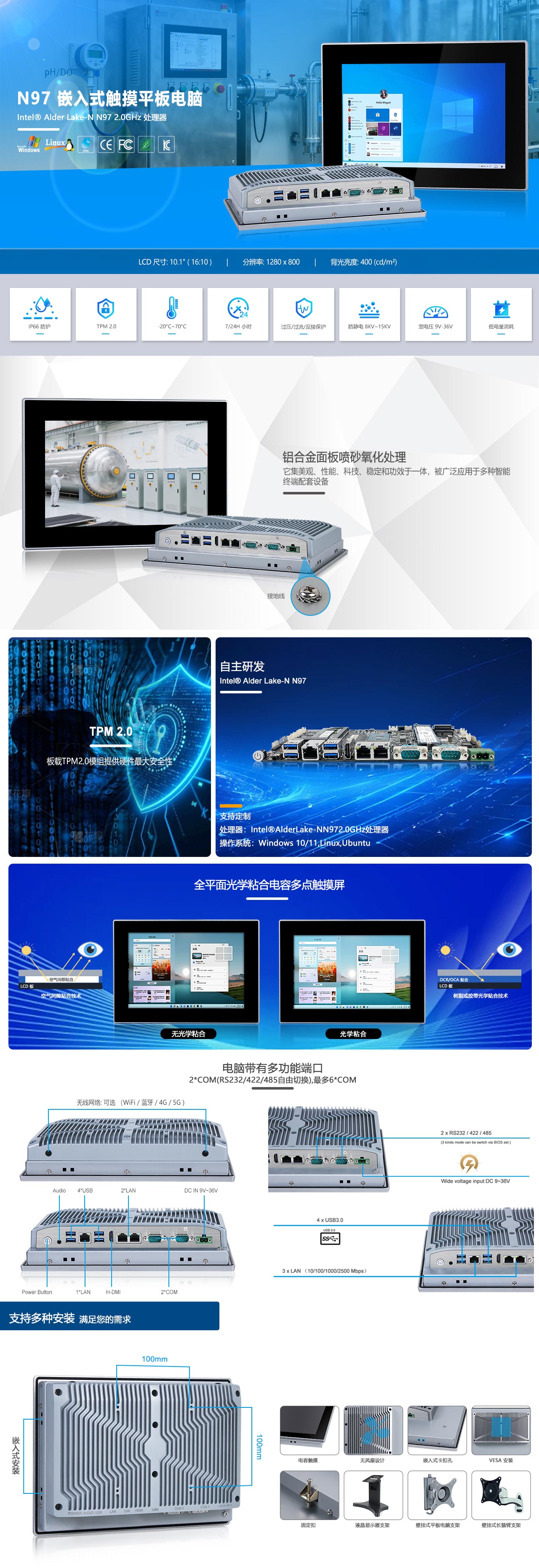 10.1寸液晶屏 / 分辨率 1280 x 800 / Intel Alder Lake-N N97 2.0GHz / 光学粘合电容触摸 / 1 x HDMI / 3 x LAN / 2 x COM(RS232 / 422 / 485)4 x USB3.0 / TPM2.0 / DC 9V~36V 宽压输入,支持过流、过压和反接保护 |