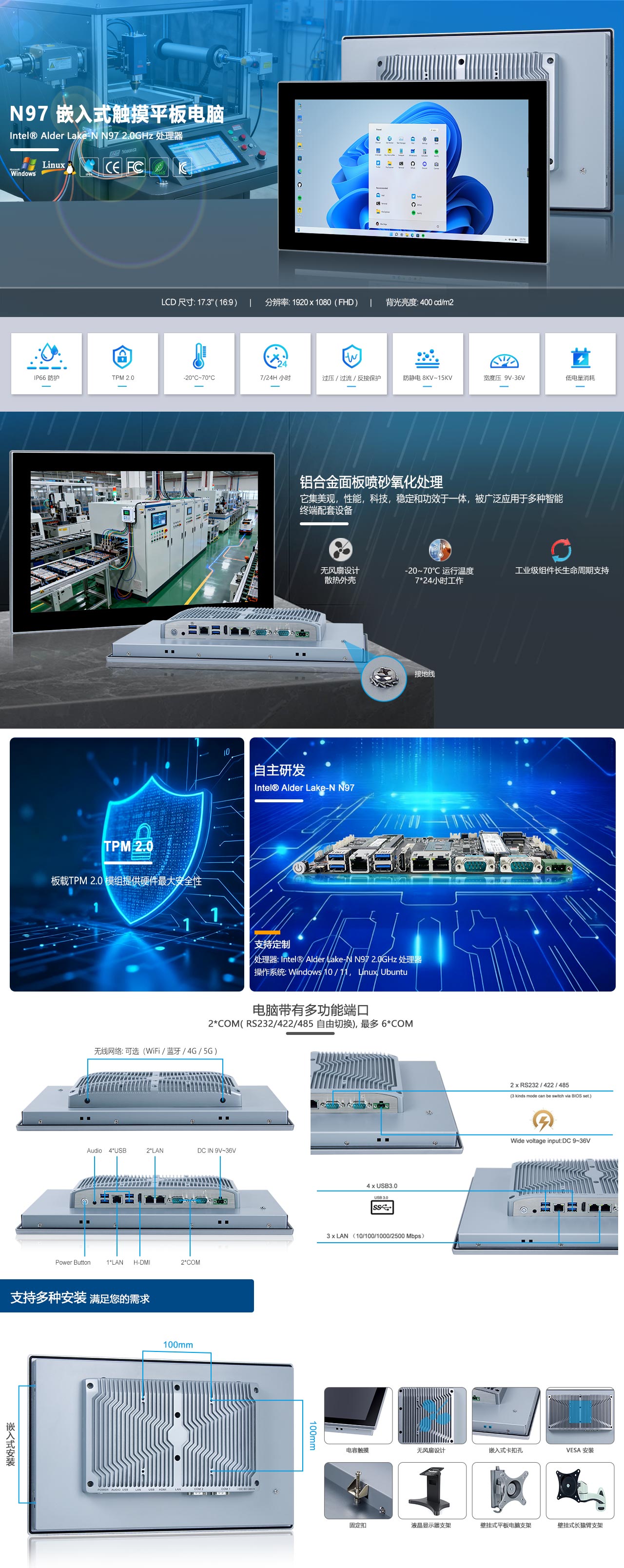 17.3寸液晶屏 / 分辨率 1920 x 1080 (FHD) / Intel Alder Lake-N N97 2.0GHz / 10点电容触摸 / 1 x HDMI / 3 x LAN / 2 x COM(RS232 / 422 / 485)4 x USB3.0 / TPM2.0 / DC 9V~36V 宽压输入,支持过流、过压和反接保护 |