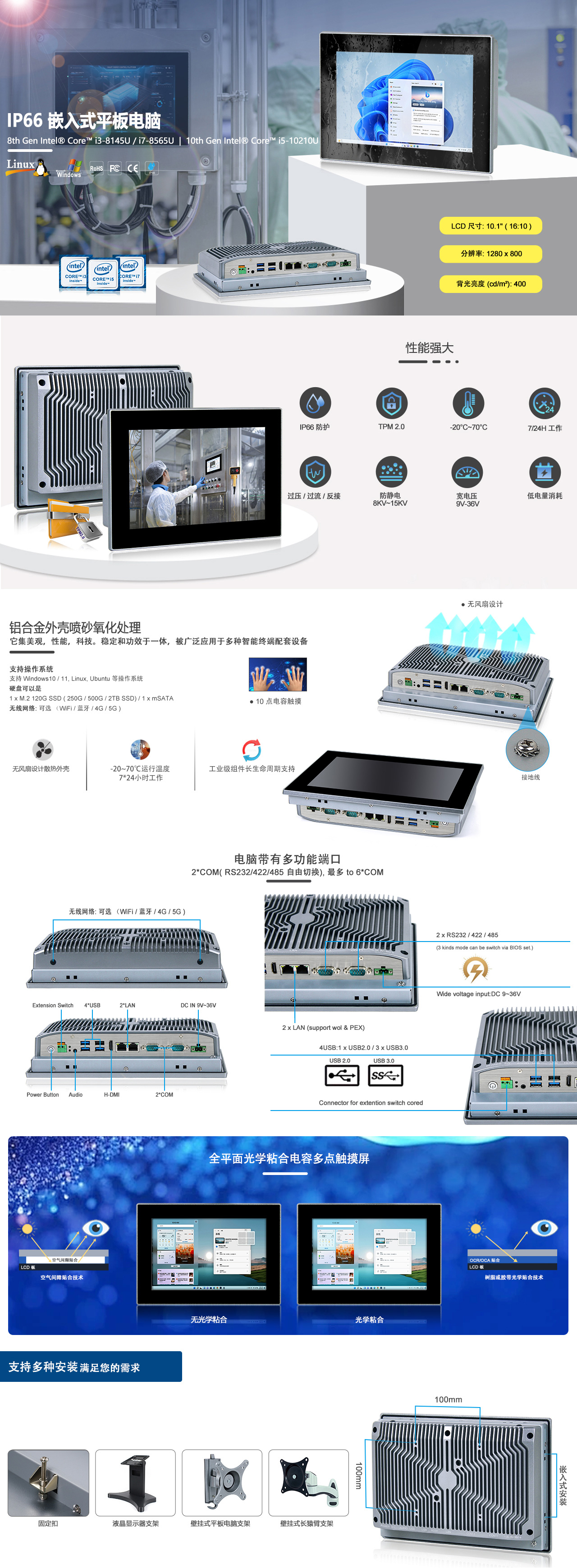 10.1寸液晶屏 / 分辨率 1280 x 800 / 8th Gen Intel® Core™ i3-8145U 2.1GHz / 光学粘合电容触摸 / 1 x H-DMI / 2 x LAN / 2 x COM ( RS232 / 422 / 485 ) / 3 x USB3.0 / 1 x USB2.0 / TPM2.0 / DC 9V~36V 宽压输入,支持过流、过压和反接保护 |