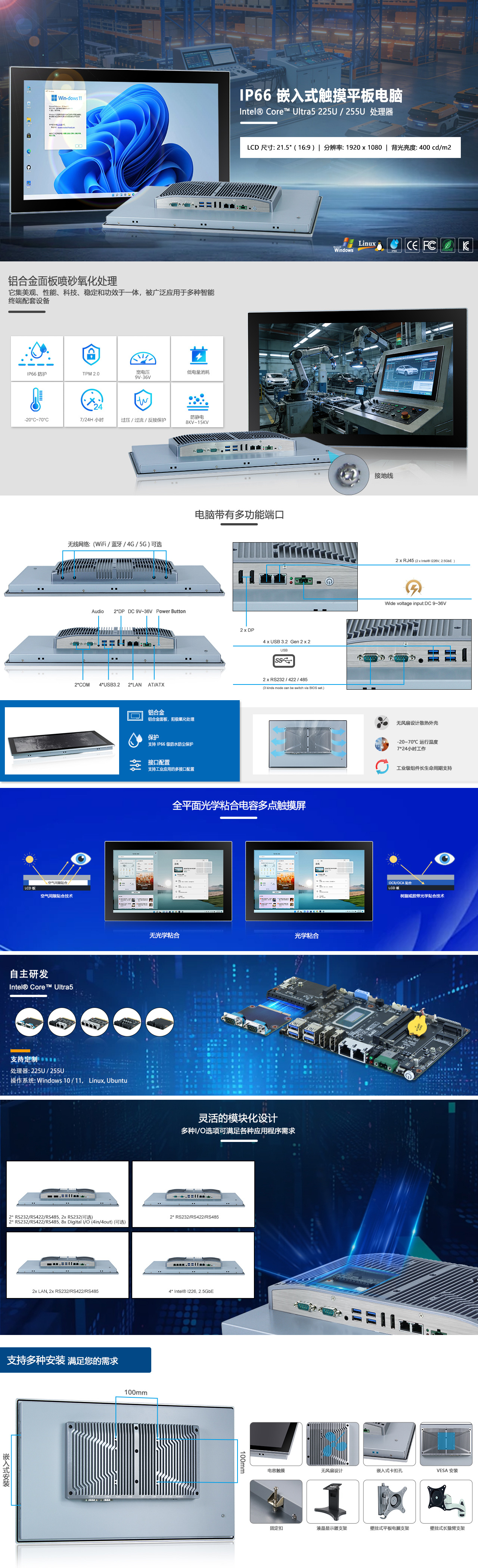 21.5寸液晶屏 / 分辨率1920 x 1080 / Intel® Core™ Ultra5 225U 1.3GHz / 光学粘合电容触摸 / 2 x DP / 2 x Intel® I226V, 2.5GbE / 4 x USB 3.2 Gen 2 x 2 / 2 x RS232/RS422/RS485,2 x RS232 / TPM2.0 / DC 9V~36V宽压输入, 支持过流、过压和反接保护 |