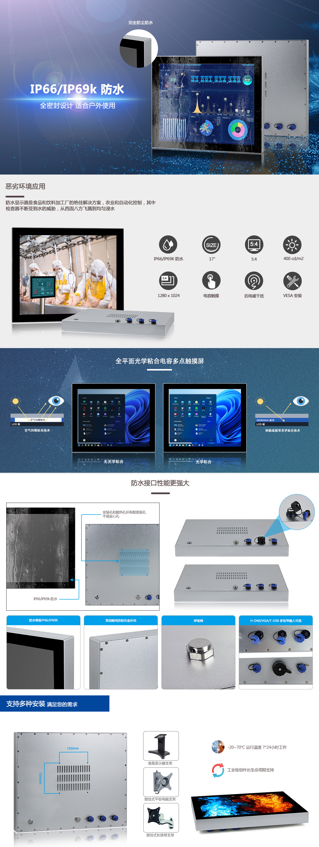 17" SXGA LED / 分辨率1280x1024 / 光学粘合电容触摸 / 1 x H-DMI / 1 x T-USB / DC 12V~24V 宽压输入 |