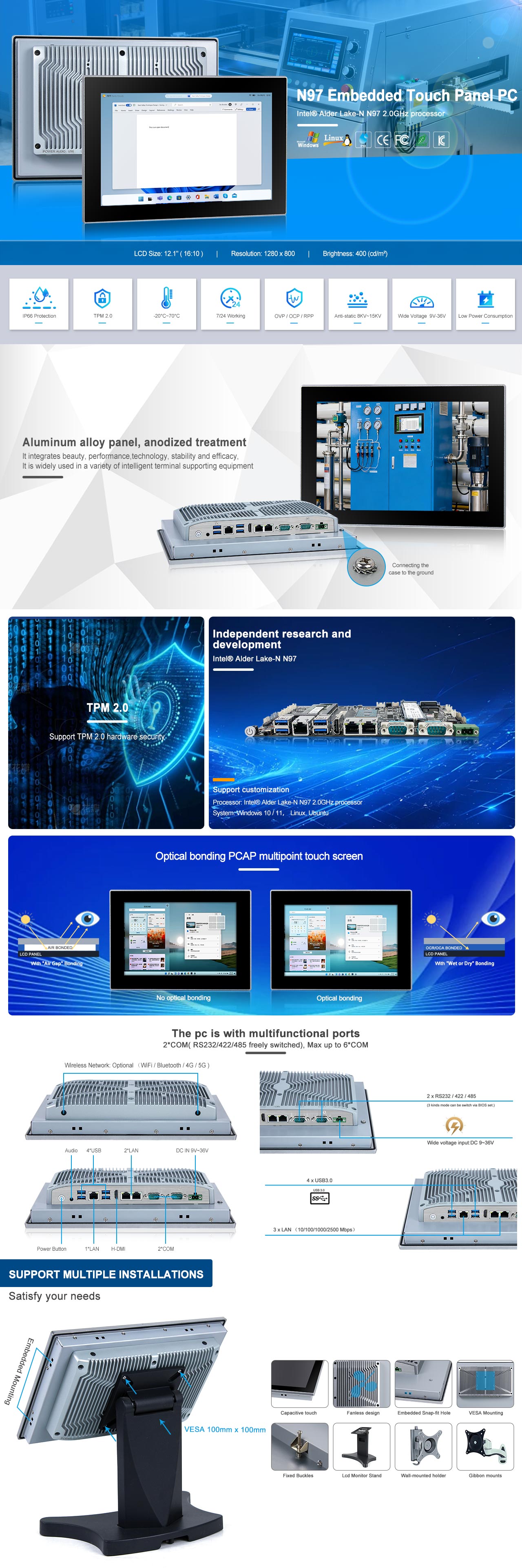 12.1" WXGA LCD / Resolution 1280 x 800 / Intel Alder Lake-N N97 2.0GHz / Optical bonding PCAP Touch / 1 x HDMI / 3 x LAN / 2 x COM (RS232 / 422 / 485) / 4 x USB3.0 / TPM2.0 / DC IN 9V~36V ( OVP / OCP / RPP ) |