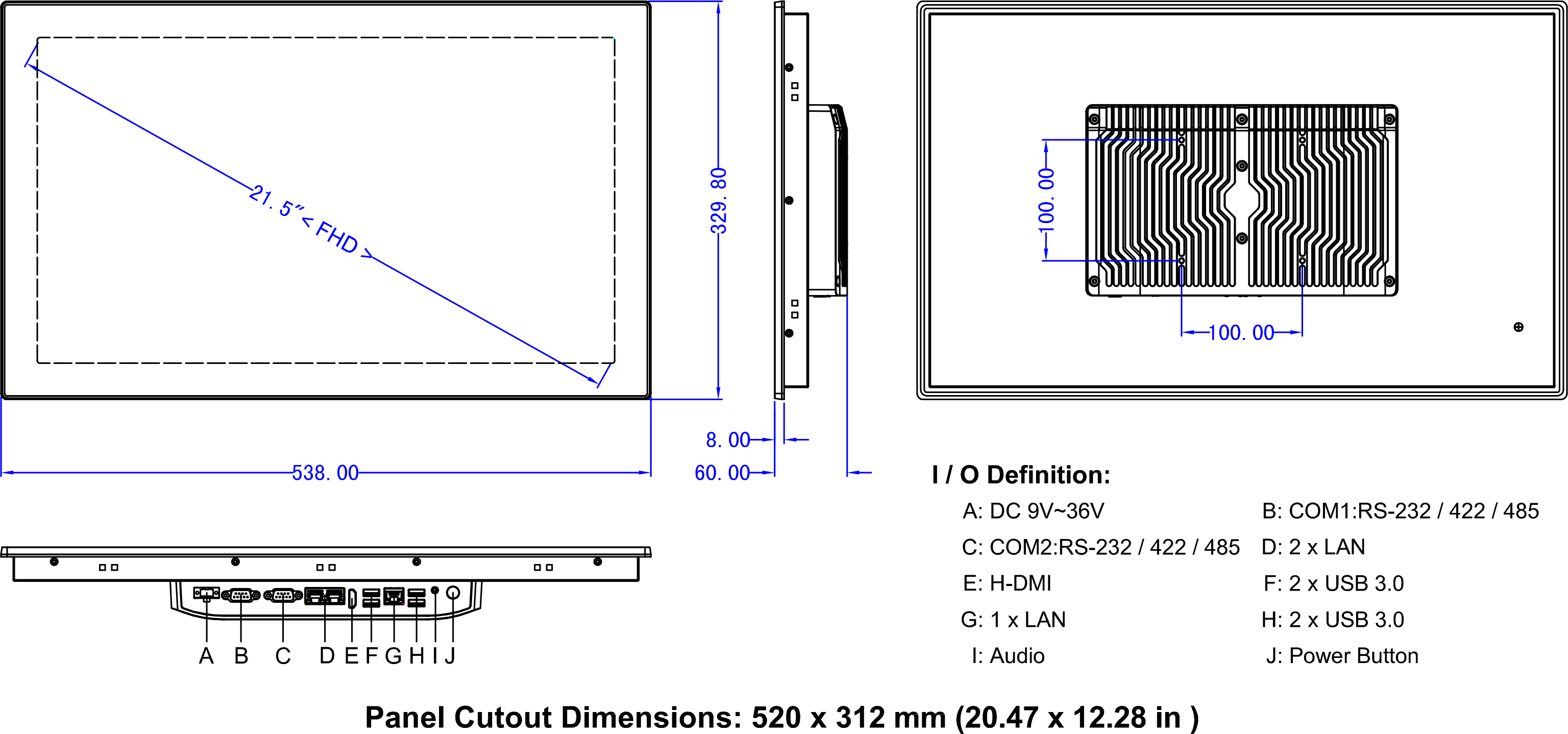 - Industrial-grade 21.5" FHD LCD panel with 50k backlight lifetime