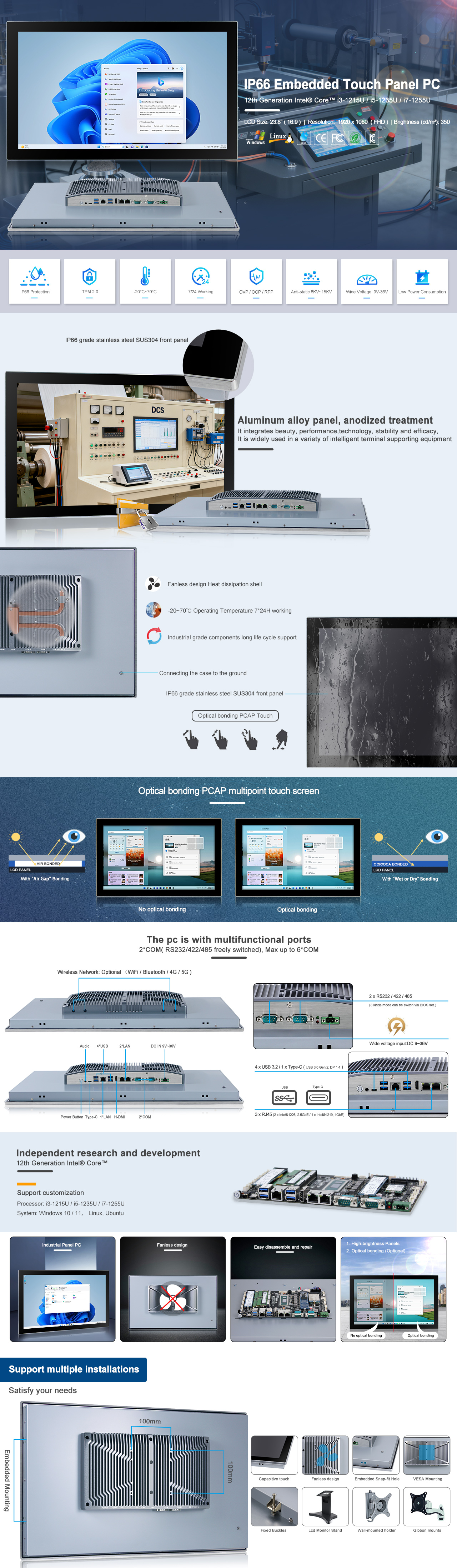 23.8" FHD LCD / Resolution 1920 x 1080 / Optical bonding PCAP Touch / 12th Gen Intel® Core™ i7-1255U 1.7GHz / 1 x H-DMI / 3 x LAN / 4 x USB3.2 / 1 x Type-C / 2 x COM / TPM2.0 / DC IN 9V~36V (OVP / OCP / RPP) |