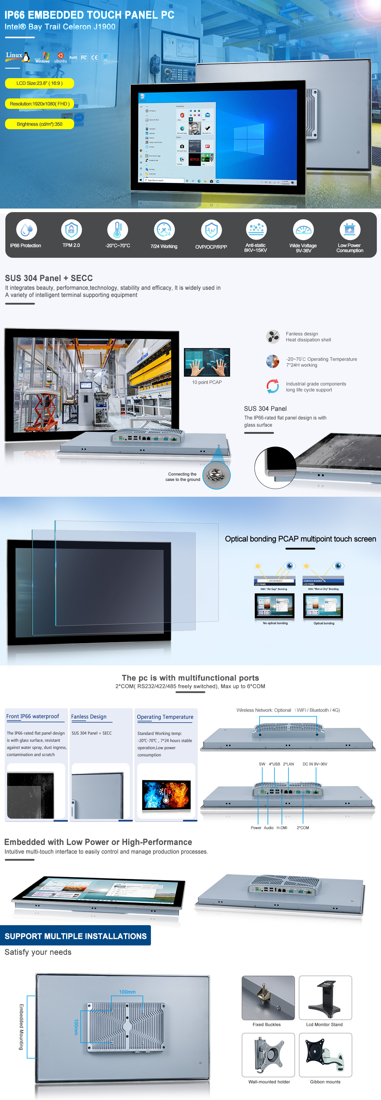 23.8" FHD LCD / Resolution 1920 x 1080 (FHD) / Intel Celeron J1900 2.0GHz / Optical bonding PCAP Touch / 1 x H-DMI / 2 x LAN / 2 x COM (RS232 / 422 / 485) / 1 x USB3.0 / 3 x USB2.0 / TPM2.0 / DC IN 9V~36V ( OVP / OCP / RPP ) |