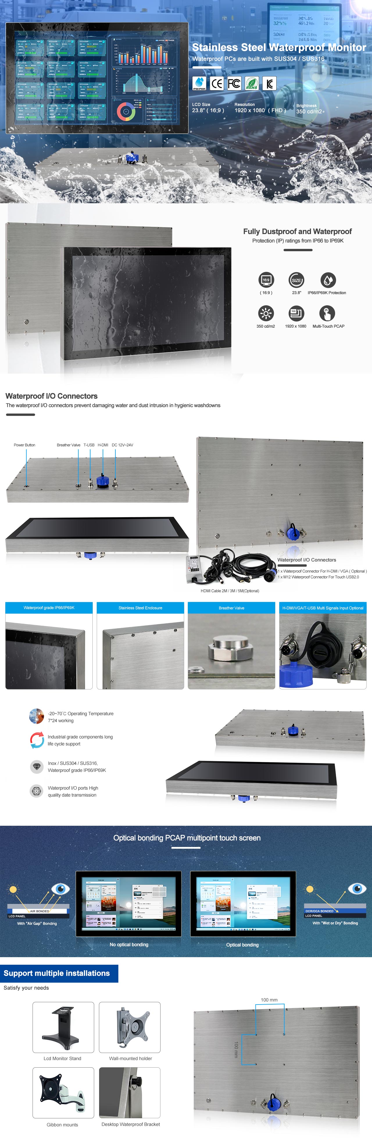 23.8”FHD LCD / Resolution 1920x1080 / Optical bonding PCAP Touch / 1 x H-DMI / 1 x T-USB / DC IN 12V~24V |